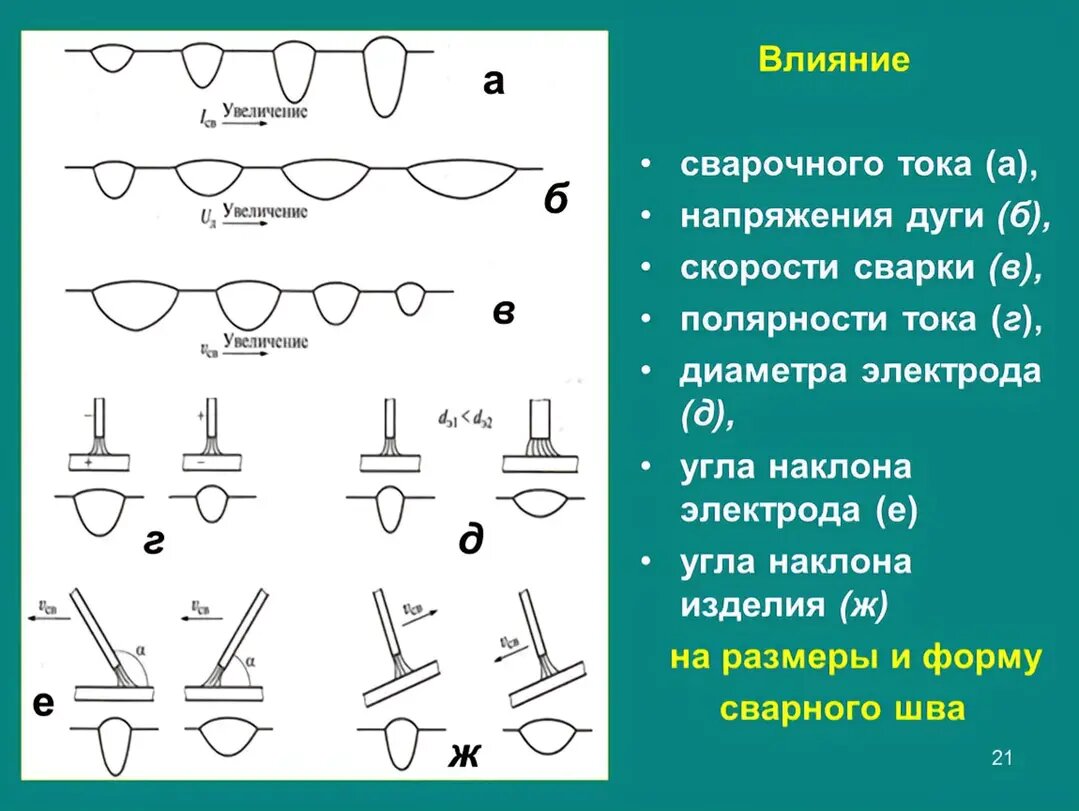 Сварной шов — это не просто соединение металлов, а комплексный результат, зависящий от множества факторов. Вот ключевые параметры, которые влияют на размер и форму сварного шва: --- 1. Сварочный ток cb: - Эффект: - При увеличении тока: Шов становится шире и глубже. - Причина: Больше тепла → больше расплавленного металла. - Пример: Для электрода 3 мм при токе 100 А ширина шва ≈ 6–8 мм. Как использовать: - Для тонких металлов (до 5 мм) — низкий ток (80–100 А). - Для толстых металлов (>10 мм) — высокий ток (120–150 А). --- . 2. Напряжение дуги д: - Эффект: - При увеличении напряжения: Шов становится узким и высоким. - Причина: Высокое напряжение создает более стабильную дугу, но меньше теплоотдачи в металл. - Пример: При напряжении 25 В шов получается более компактным. . Как использовать: - Для тонких металлов — низкое напряжение (20–25 В). - Для толстых металлов — среднее напряжение (25–30 В). --- 3. Скорость сварки cb: - Эффект: - При у