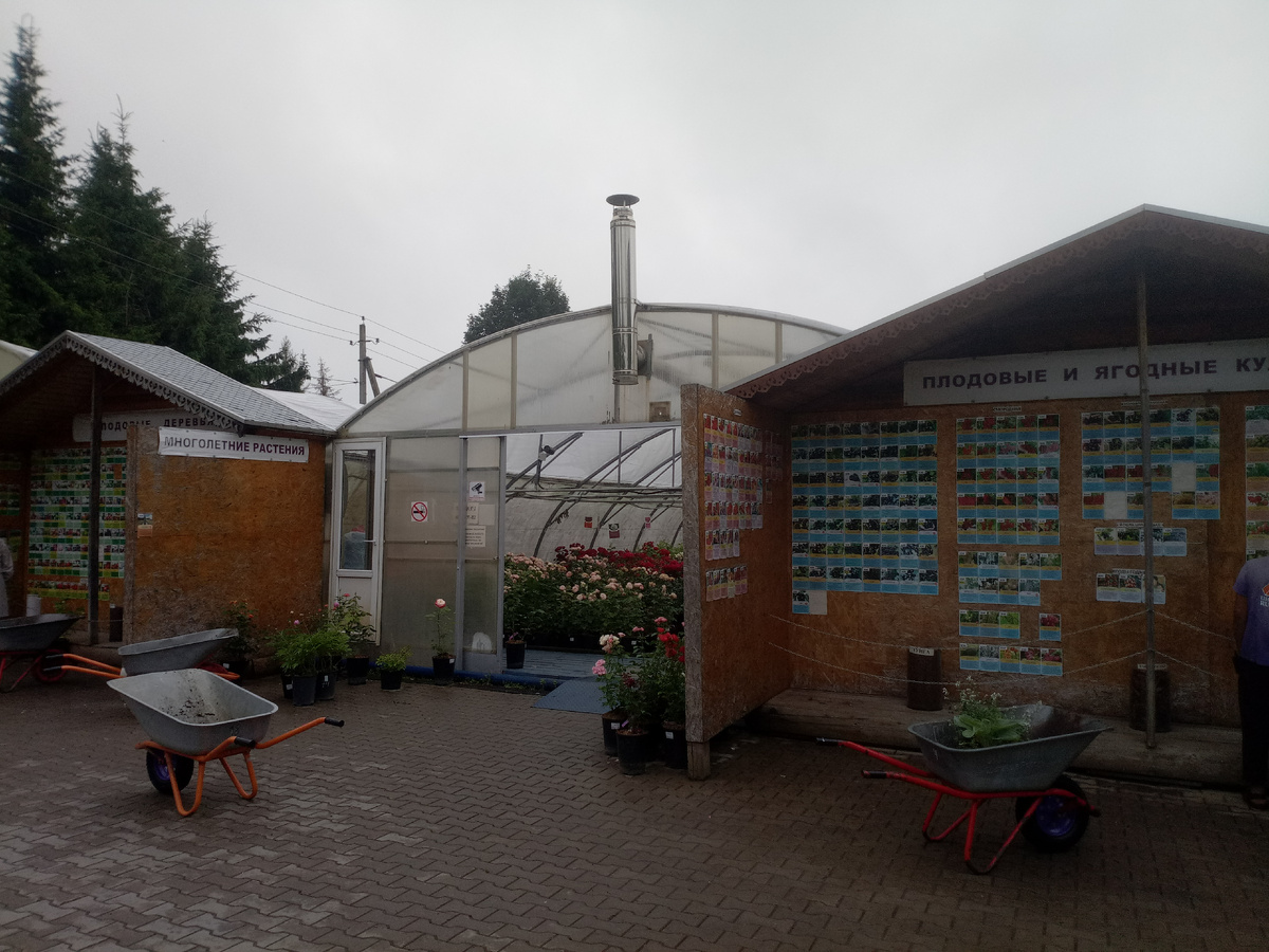 Находится Русроза в Солнечногорском районе Московской области, в деревне Якиманка. Питомник и торговая площадка у них просторные. Теплицы с саженцами роз широкие, ходить и выбирать очень удобно. Над каждым сортом висят таблички с описанием. На горшках тоже этикетки с фото.