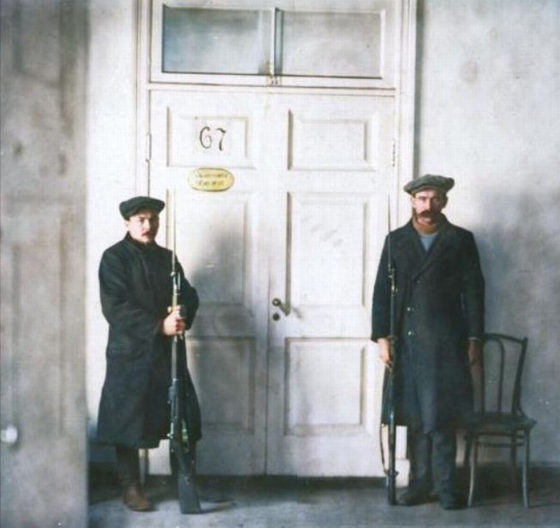 Получается, что у Владимира Ильича и Льва Давидыча был в Смольном общий кабинет. Фотография была опубликована в буржуазном журнале «Нива» и сделана его фотокорреспондентом Петром Оцупом (1883—1963). Имена часовых тоже известны — это красногвардейцы литовец Эдуардас Юргайтис (слева) и латыш Эдуардас Звиргздиньш. Они были рабочими телефонно-телеграфного завода «Конрад Лоренц» и неоднократно дежурили на посту у кабинета Ленина и Троцкого. Звиргздиньш потом вспоминал, что когда к ним явился фотограф Оцуп с большим фотоаппаратом и треножником в руках, то они стали требовать разрешения на съёмку, завязался спор. На шум открылась дверь кабинета, и появился Ильич. Выслушав фотографа, он сказал: «Время и место съёмок вы выбрали неудачное. Но раз пришли — фотографируйте»...