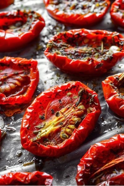 Идеальная закуска для салатов, паст, пиццы и бутербродов. Сохраняют летний вкус и полезные вещества! --- Ингредиенты: - Томаты (лучше сливовые или черри) — 1 кг. - Оливковое масло — 100–150 мл (для хранения). - Соль морская — 1–2 ч. л. - Сахар — 1 ч. л. (опционально, для баланса вкуса). - Специи по вкусу: сушеный орегано, базилик, чеснок, розмарин, черный перец. --- Пошаговый рецепт: 1. Подготовка томатов: - Промойте и обсушите томаты. - Разрежьте сливовые вдоль на 4–6 частей, черри — пополам. - Удалите семена и сок ложкой (так томаты быстрее подвялятся). 2. Маринад: - Выложите дольки на противень срезом вверх. - Посыпьте солью, сахаром и специями. - Сбрызните оливковым маслом (не обязательно, но добавит аромат). 3. Вяление: - В духовке: - Разогрейте до 100–120°C. - Поставьте противень в духовку, приоткройте дверцу (чтобы испарялась влага). - Готовьте 3–6 часов (время зависит от размера долек). Томаты должны стать мягкими, но не хрустящими. -