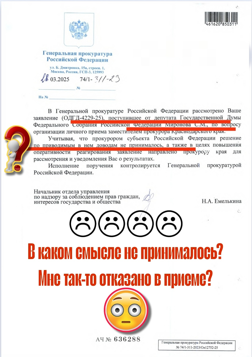 - Ситуация, когда Генеральная прокуратура РФ (ГП РФ) активно реагирует на обращения только в случае поступления депутатского запроса, а на обычные жалобы граждан отвечает формально или перенаправляет их в нижестоящие инстанции, вызывает вопросы о справедливости и эффективности работы органов надзора.
