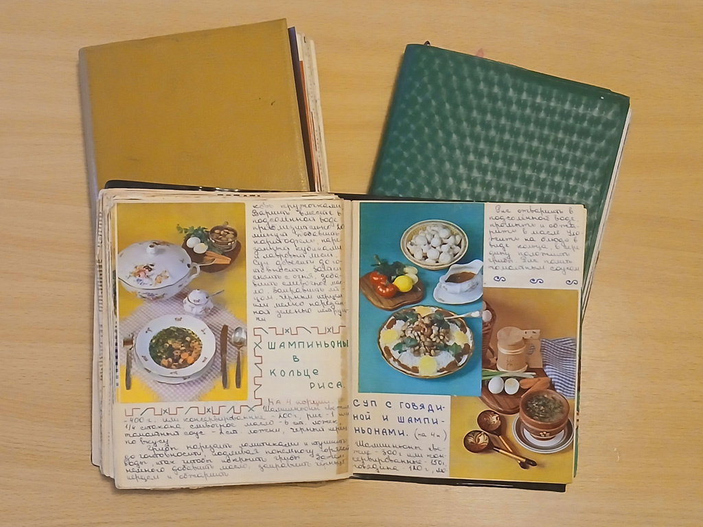 В далёкие-далёкие годы, наверное, каждая советская хозяйка имела заветную тетрадку (а часто даже и не одну) для записи кулинарных рецептов. Вполне возможно, что явление это было интернациональным, но я буду рассматривать на примере таких тетрадей, что отдала мне мама. Почему отдала? Ну, во-первых, всё новое стало сейчас гораздо доступнее в силу наличия в Интернете чего угодно, во-вторых, любимые рецепты давно уже в памяти запечатлены. Итак, таких тетрадей у мамы три! Самая старая - наверняка старше меня, была столько, сколько я себя помню Клей не перенёс испытания временем - ни тот, которым склеена сама тетрадь, ни тот, которым мама вклеивала вырезки Тетрадь чуть помоложе - мне нравилось рассматривать картинки со всякими необычными блюдами. Да и почерк мамин мне нравился настолько, что став старше попытался выработать похожий - вполне получилось. Увы, сейчас умение, можно сказать, утрачено - компьютер, дааа... Часть из того, что было в тетрадях, вполне себе продавалось в магазине и был