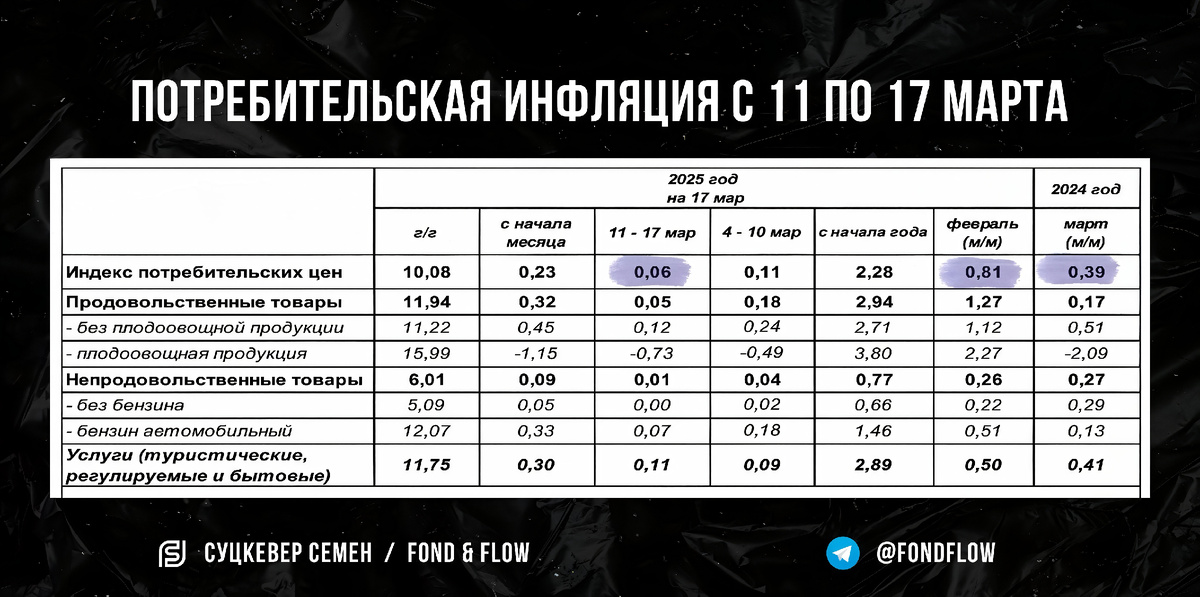 - 🔹 Недельная инфляция — 0,06% (против 0,11%, 0,15% и 0,23% ранее). Новый минимум недельного роста цен в 2025 году. В таком темпе мы действительно можем увидеть отрицательные значения уже в апреле.