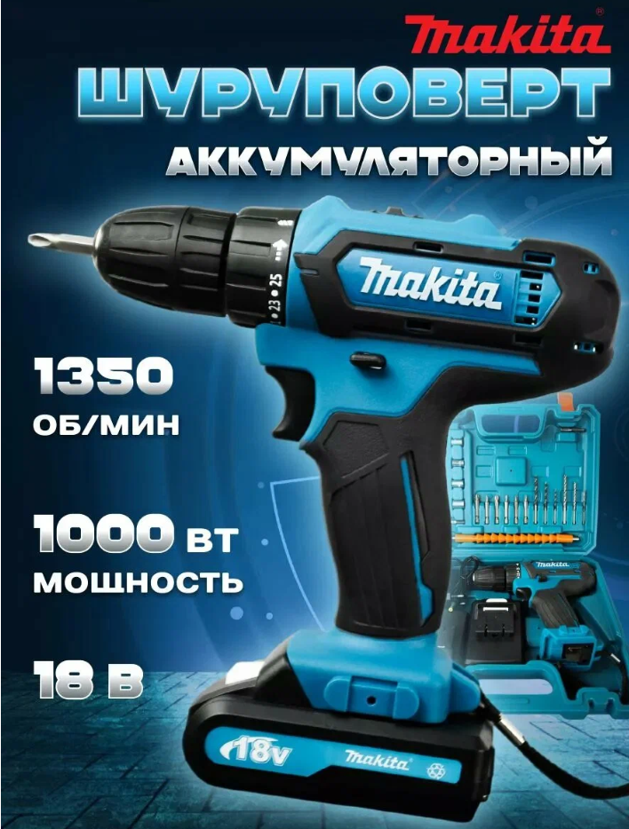 Шуруповёрт Makita с двумя аккумуляторами включает все, что нужно для работы. Давайте рассмотрим основные элементы: