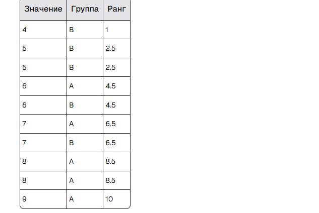 - R1 (сумма рангов группы A) = 4.5 + 6.5 + 8.5 + 8.5 + 10 = 38