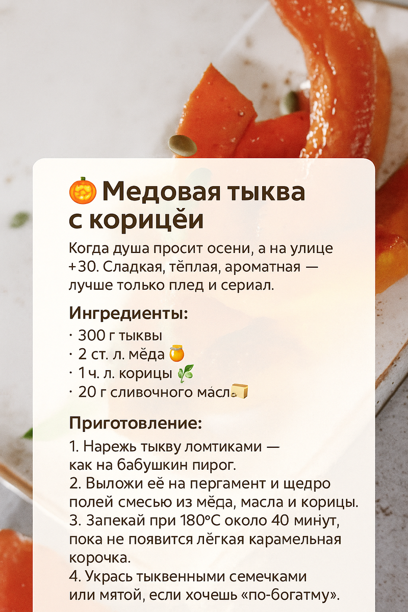 🎃 Медовая тыква с корицей — десерт, после которого ты простишь осень за всё ☔ 🛒 Ингредиенты: • 300 г тыквы • 2 ст. л. мёда 🍯 • 1 ч. л. корицы 🌰 • 20 г сливочного масла 🧈 👨🍳 Приготовление: 1️⃣ Нарежь тыкву ломтиками, как жизнь нарезала тебе планов на отпуск. 2️⃣ Противень застели бумагой, выложи тыкву. 3️⃣ Смешай мёд, корицу и масло, обмажь тыкву этой сладкой магией. 4️⃣ Запекай в духовке 40–60 минут. Не забудь украсить листьями мяты — они делают вид, что всё это очень полезно. 🤫 Отлично подходит к вечернему чаю, сериалам и размышлениям о смысле жизни. Или о смысле второго куска. --- #тыква #медовыедесерты #вкусноиполезно #готовимдома #осеннийрецепт #десертдня #здоровоепитание #шуткадня #рецептысюмором #вкусняшка