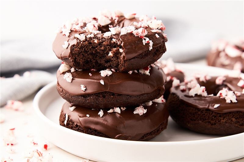 Роскошный вкус шоколада, легкое мятное послевкусие и минимум жира в рецепте печеных шоколадных пончиков сделают их вашей любимой выпечкой. Потрясающе красиво, ароматно и шоколадно! К завтраку, ужину или просто – с дневной чашечкой кофе. Ингредиенты: 200–250 г муки; 200 мл кефира; 2 ч. л. разрыхлителя; 2 ст. л. сливочного масла; 3 ст. л. сахара; 4 ст. л. какао; 30 г листьев свежей мяты; 2 яйца. Приготовление: Мяту мелко порубить. Соединить в глубокой миске просеянную муку, какао, разрыхлитель и сахар, перемешать. В сотейник выложить сливочное масло, растопить его. Соединить с яйцами и кефиром, немного взбить миксером. Кефирную массу соединить с сухими ингредиентами, добавить мяту и замесить тесто. Выложить тесто в специальные формы для пончиков, поставить в предварительно разогретую до 190 °С духовку на 20 минут. Готовую выпечку можно присыпать сахарной пудрой или украсить глазурью (сливочной или шоколадной).