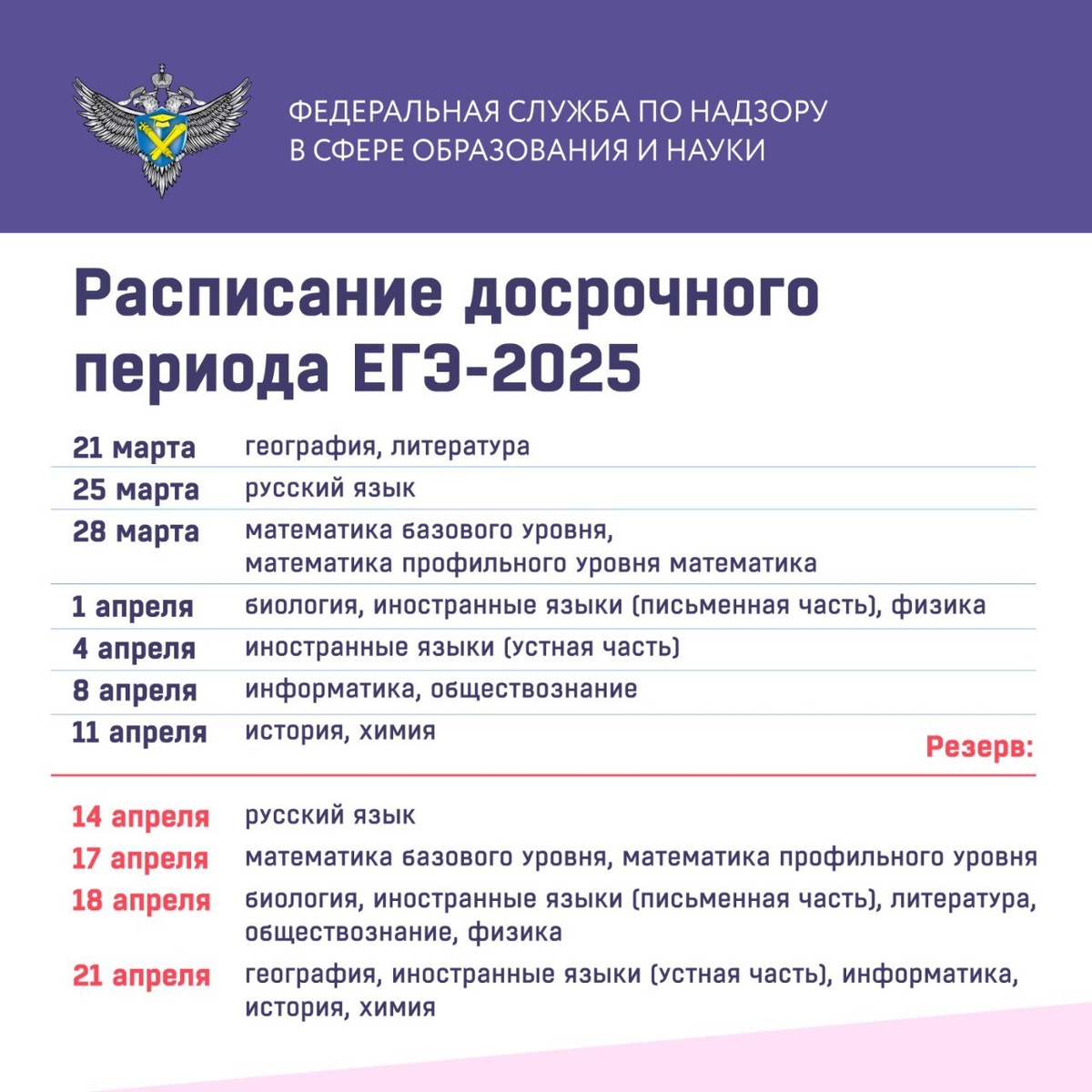 В России 21 марта стартует досрочный период сдачи единого государственного экзамена, передает корреспондент Агентства новостей «Доступ». Для организации ЕГЭ будет задействовано 130 пунктов проведения экзаменов в 66 регионах. Досрочный период 21 марта начинается с экзаменов по географии и литературе; 25 марта пройдет ЕГЭ по русскому языку, 28 марта – математике базового и профильного уровней, 1 апреля – биологии, физике и письменная часть ЕГЭ по иностранным языкам, 4 апреля – устная часть ЕГЭ по иностранным языкам, 8 апреля – ЕГЭ по информатике и обществознанию, 11 апреля – истории и химии. С 14 по 21 апреля в расписании предусмотрены резервные дни для сдачи всех предметов. Наиболее популярные предметы у участников досрочного периода – русский язык, базовая и профильная математика, обществознание и биология, сообщили в Рособрнадзоре.