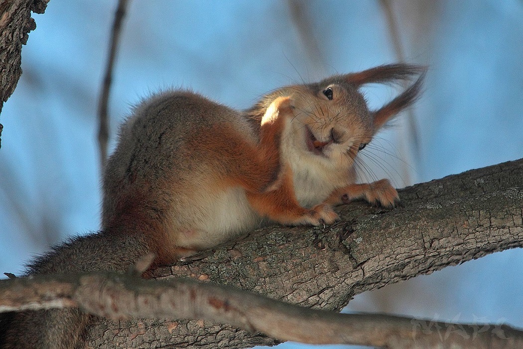 Веселые белочки спустились с дерева кругами, в поисках общения и угощения. Они попискивали и показывали лапками то на голодный животик, то на рот.