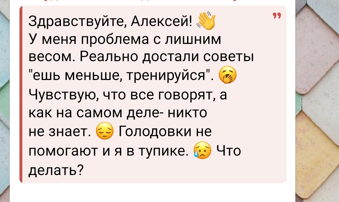 Попробуем вместе разобраться. Предупреждаю, будет жутко больно, но по сути .💯 Пишу не для тех, кто ищет простые решения, типа "жри меньше ".☝️ Меньше жрать Вы сможете и без моей помощи (хотя не факт, кто -то не сможет). Пишу для тех, кто объективно ест много. И имеет приличный лишний вес. Я говорю не о жалких 4-5 килограммах, речь именно про невыносимо большой лишний вес (ужасный внешне и с точки зрения здоровья) и людей,которые потребляют выше своей нормы калорий. Как с этим бороться? Те, кто давно меня знают, уже в курсе, что я не сторонник мрачных взглядов в стиле : 😿"Никакого сладкого" 😿"Голодайте, урезаем питание на максимум" 😿"Ходите в зал пахать по 5 раз в неделю" Почему? Да потому что с таким подходом большинство ⚠️ПЕРВОЕ: не похудеют значительно ⚠️ВТОРОЕ: не дойдут до своего целевого веса ⚠️ТРЕТЬЕ: те "счастливчики", кто все же дойдёт, вряд-ли смогут удержать результат. Значит такой подход не решит проблемы!👎 Вообще нет единственно и неповторимого верного решения