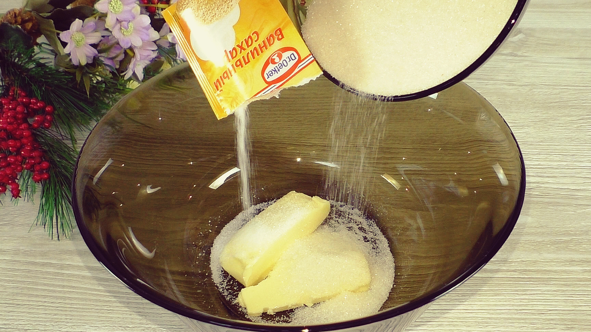 В миску с маслом комнатной температуры отправляю щепотку соли. Добавляю сахар, по желанию ванилин или ванильный сахар. Перемешать удобнее и быстрее миксером.