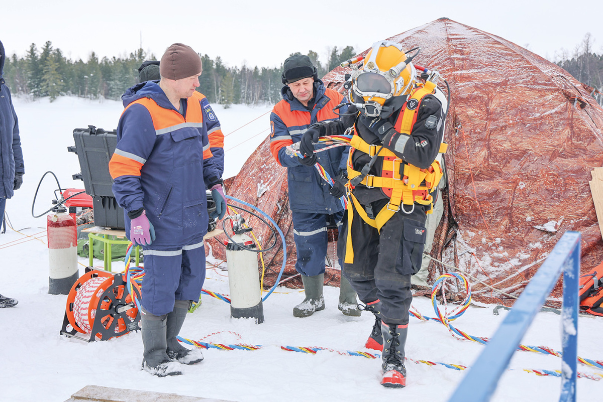 Текст и фото: Гордей Юрьев Конкурс состоял из двух этапов: теоретического и практического. В первом блоке знания участников оценивали с помощью тестирования. В него вошли вопросы по охране труда, техническим средствам, снаряжению и приспособлениям при проведении водолазных работ, а также - медицинской тематике. Затем спасатели-водолазы отправились в бассейн «Пуровский». Здесь было необходимо как можно быстрее снять и надеть маску под водой, проплыть 100 метров на время и оказать помощь утопающему. Сделать это было не сложно: условия, по словам водолазов, курортные: вода чистая, тепло, костюмы не сковывают движения. На следующий день прошли испытания на открытом воздухе. Реально приближённые условия стали для водолазов отличной возможностью для отработки навыков. Прорубь на озере Окунёвое подготовили заранее. Обычно такие профессиональные учения проходят летом, но зимние практики тоже важны, ведь беда может случиться в любую минуту. Поэтому водолазы должны уметь действовать в любых к