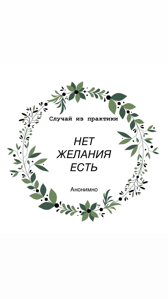 Клиент: женщина, 36 лет. Проблематика: нет желания есть еду (мама настояла на походе к психологу). Запрос на психотерапию: хочется выяснить, что происходит, почему нет желания есть. Клиентка сообщила, что забывает поесть, потому что ей не хочется. Удовольствие от пищи отсутствует. Женщина выглядит изможденной, грустной, неэмоциональной и неэнергичной. Интереса к психотерапии у неё нет. Мама клиентки настояла на походе к психологу, потому что переживает за дочь, ввиду того, что та часто находится в унылом состоянии и стала худеть, отказываться от еды. Равнодушие к еде является одним из признаков постоянного стресса или депрессии. Я попросила рассказать её о своей жизни. Женщина сказала, что у неё муж, дети, хорошая работа, много домашних дел, что она устала от однообразия жизни. Муж часто отсутствует дома, взаимопонимания с ним нет, приходится самостоятельно справляться с детьми и хозяйственными вопросами. Считает, что живёт нормально. Запроса на терапию у неё нет. Пришла, чтоб