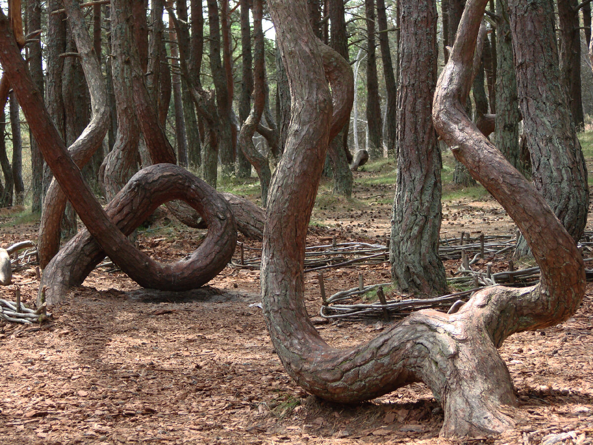 Если будете на Куршской косе в Калининградской области, обязательно загляните в танцующий лес. В этом лесу растут деревья со странно изогнутыми стволами. Явление это довольно молодое, потому что странным деревьям немного более 60 лет. Деревья высаживались в 1960-х годах для закрепления бесконтрольно движущейся почвы странствующих дюн. Сначала этот участок леса называли «пьяным», позже сменили на более благозвучное «Танцующий лес». Хвойные деревья здесь не танцуют в прямом смысле, конечно, но их стволы так причудливо изогнуты, как будто они застыли в танце. Кстати, они занесены в Список Всемирного наследия ЮНЕСКО. Танцующий лес на Куршской косе стал привлекать много туристов и, чтобы защитить природную достопримечательность, вокруг деревьев установили изгороди. Лес здесь засажен исключительно соснами. Некоторым деревьям люди дали имена: дерево Счастья, Ведьмино Кольцо, Дьявольские Ворота; придумали мистические объяснения феномену этого леса. Наиболее распространенная версия причудливого