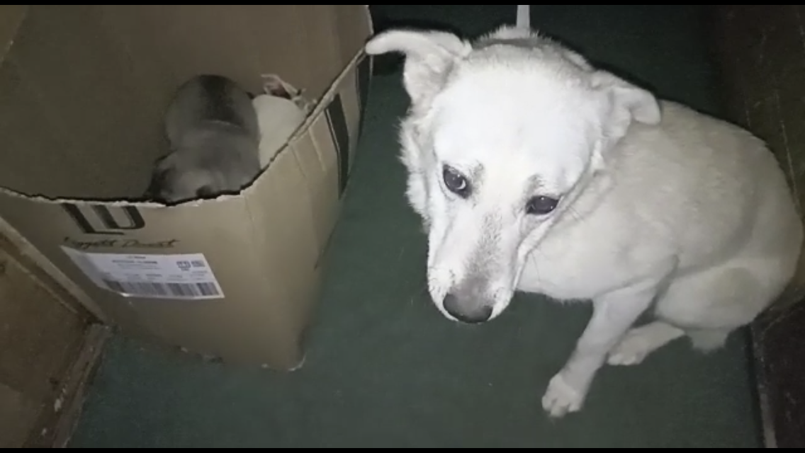а рядом её дети в коробке. Собаку привязали ночью к нашему забору, а рядом поставили коробку с её щенками. Щенков трое и они уже открыли глазки, им несколько недель. Все четверо, включая маму, чистенькие, ухоженные, так почему же они оказались у нас под забором? Среди ночи кто-то позвонил в звонок приюта, возле калитки. Один из рабочих, сонный, вышел посмотреть кто звонил. Когда открыл калитку, там уже никого не было, кроме привязанной к забору грустной собаки, которая молча сидела, склонив голову, а рядом с ней пищащая коробка. Телефон парень с собой не взял, поэтому не удалось заснять этот момент, да и не факт, что он снял бы их, на улице было очень холодно и он потащил сразу коробку и маму в тепло. До утра собака с щенками остлась в доме , а утром их устроили в вольере в будке. Собаку назвали Теона, очень красивая, но уж очень грустная. Естественно она не понимает, что случилось, почему она привязана у чужих ворот, почему её дети рядом в коробке... Очередной стресс... Это невын