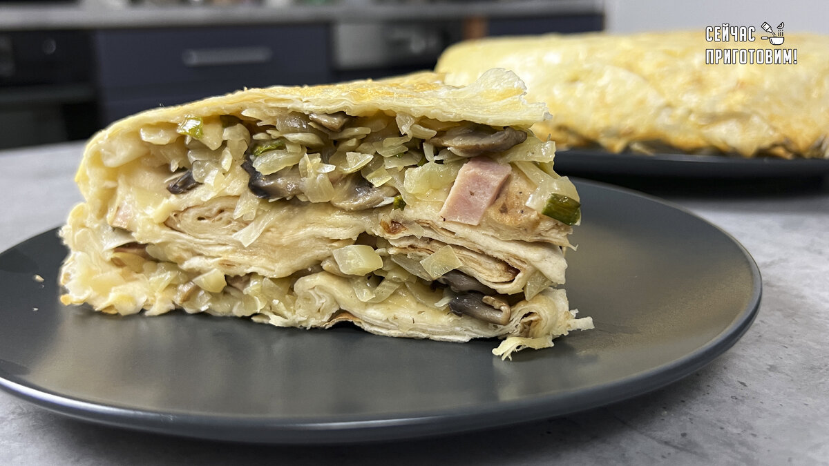Иногда не хочется часами стоять у плиты, а провести больше времени с семьей. Но побаловать родных чем-нибудь вкусненьким просто необходимо. Пирог из лаваша можно считать идеальным изобретением для тех, у кого постоянно не хватает времени на приготовление вкусной выпечки. Причем, как несладкой, так и сладкой. Давайте готовить: Шампиньоны обжариваем на сухой сковороде до испарения жидкости. На сковородку наливаем немного растительного масла. Нарезаем лук и добавляем к грибам, перемешиваем и готовим до прозрачного состояния лука. Добавляем капусту и готовим до полуготовности капусты. За несколько минут до готовности добавляем соль, перец по вкусу. Перемешиваем и снимаем с огня. Нарезаем ветчину и добавляем к овощам. Добавляем зеленый лук и перемешиваем. Смазываем сковороду растительным маслом и выкладываем 2 листа лаваша крест на крест. Выкладываем половину начинки. Готовим заливку. Соединяем 2 яйца и стакан кефира. Лист лаваша рвем на кусочки и смачиваем в кефире. Выкладываем на начинку