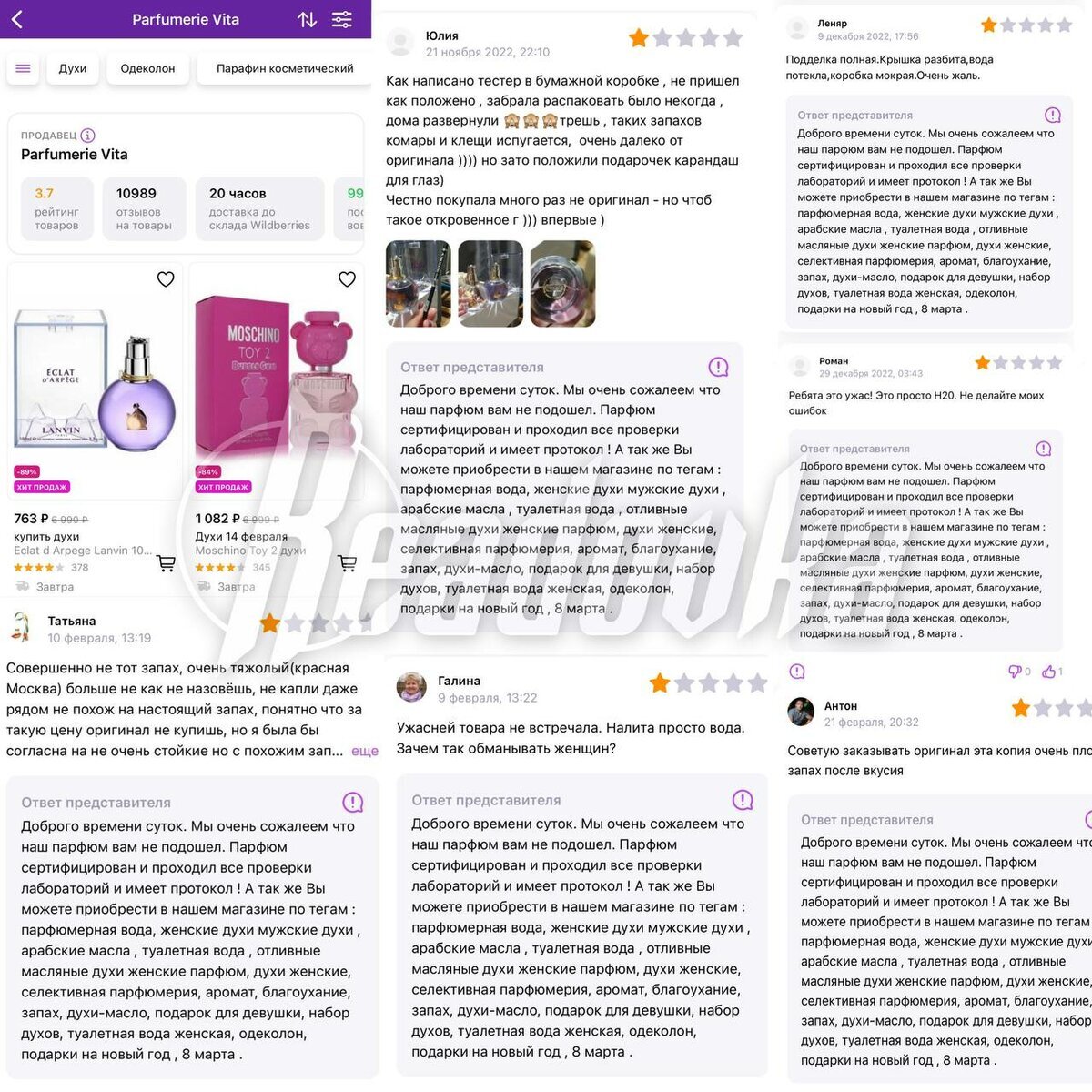 Роспотребнадзор объявил охоту на нелегалов маркетплейса. Продавцов с маркетплейсов обяжут проходить проверку на подлинность и легальность товаров перед их продажей. Данная инициатива уже рассматривается в Роспотребнадзоре. По их мнению, подобное контролирование может решить проблему с контрафактной и нелегальной продукцией, сообщают «Известия». Ведь сейчас на площадке полно паленки. Readovka рассмотрела отдел парфюмерии на Wildberries, где люди массово жалуются на духи, запахом которых только «клопов травить». Зачастую покупателям вместо приятного аромата приходит спиртованный одеколон в помятой коробке. Причем продавцы, дабы как-то оправдать свою подделку, ставят скидку на продукт 89%, подписывая флаконы как «хит продаж». Наглядный пример очередного незаблокированного «разводняка» c рейтингом товаров 3.7, который до сих пор торгует браком, а на все жалобы покупателей выработал один ответ: «Мы сожалеем, что парфюм не подошел, наш товар проходил все проверки». Очевидно, что после вступ