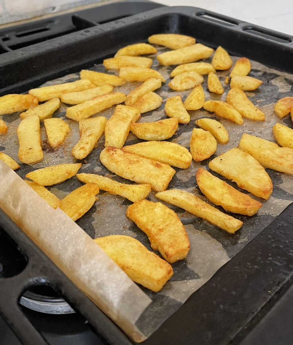 Сколько бы я не заказывал доставок картошка фри или по-деревенски никогда не доезжает хрустящей. Замучившись есть вялую, мокрую и не особо вкусную картошку, я решил приготовить сам и получился вот такой простой, но очень вкусный рецепт картошечки. На понадобится: - картошка (столько сколько вам захочется съесть) - любимые приправы Картошку чистим от кожуры (можете оставить кожуру тогда просто очень хорошо помойте, чтобы не осталась земля). Режем произвольно как вам захочется можете красиво дольками или вообще квадратиками вообще без разницы. Кладем картошку в кастрюлю, заливаем водой и ставим на сильный огонь. После того как вода закипит засекаем 5-7 минут в зависимости от того как вы порезали картошку (большие ломтики 7 минут, а маленькие 5 минут). Далее, сливаем воду и прямо в кастрюлю наливаем растительное масло, специи (абсолютно любые на ваш вкус) и самое главное добавляйте обильное количество соли (если любите соленую картошку) и тщательно перемешиваем. Берем противень смазывае