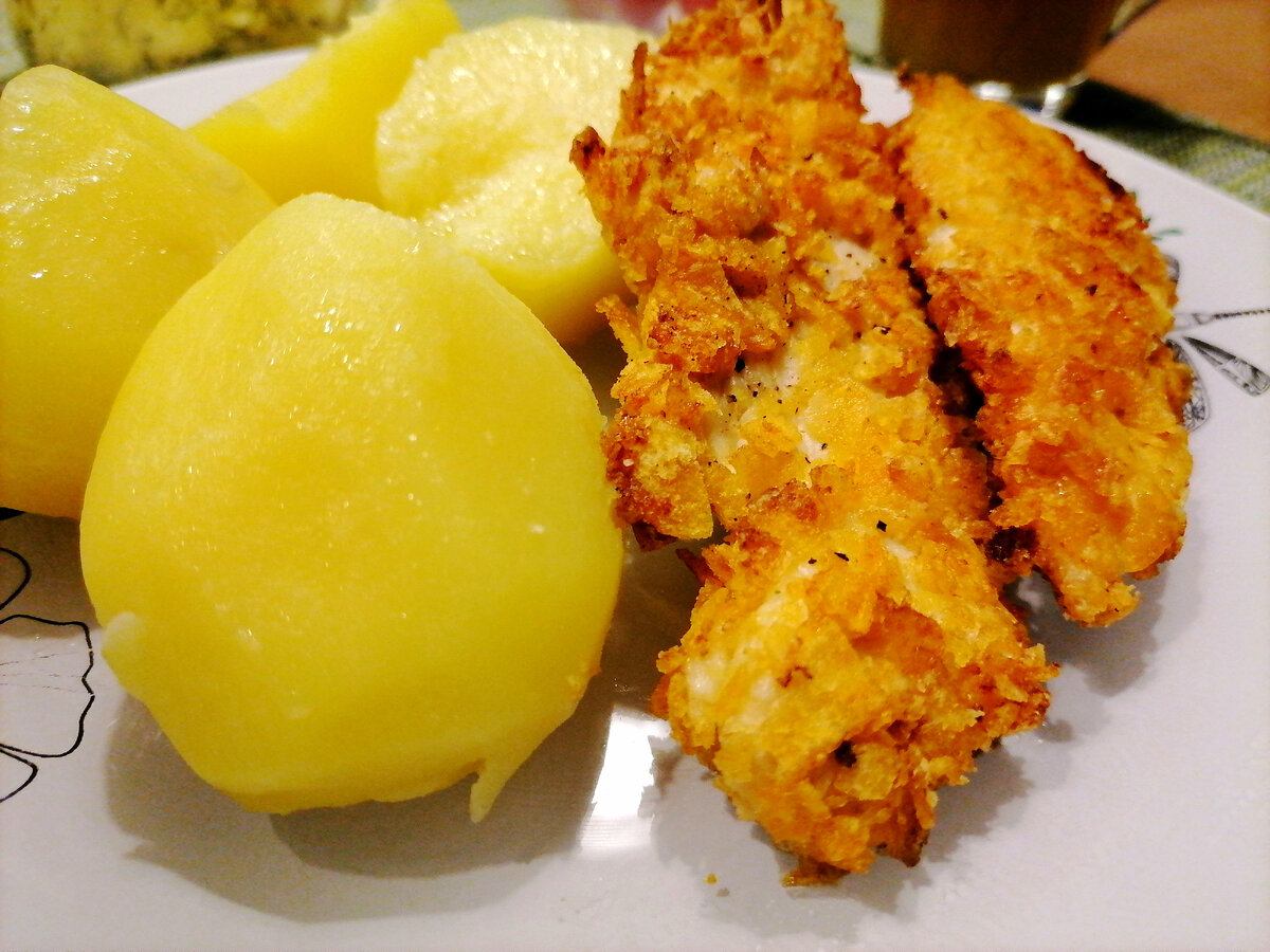 Рецепт очень прост! А курочка получается очень вкусная - сочная внутри и хрустящая сверху. Весь вкус в обсыпке. А понадобятся нам для этого картофельные чипсы. Любые, какие вам нравятся. Куриное филе нарезать брусочками. Я взяла грудку, можно взять и мякоть бедра. Да и нарезка не имеет значения. Чипсы измельчить, я размяла прямо в пакете. Будем панировать мясо. В одной тарелке взбить вилкой два яйца, во вторую насыпать немного муки, в третью чипсы. Противень застелить пергаментом. Сначала филе обвалять в муке, стряхнуть лишнюю. Затем обмакнуть в яйцо и окунуть в чипсы. Выложить на противень. И так далее. Я не солила, т. к. мои чипсы были достаточно солеными. По желанию можно ещё поперчить. Запекать в заранее разогретой до 180 гр духовке 20 минут. Если кусочки толстенькие, то 25. Пересушивать тоже не надо. Я ещё сделала соус - смешала майонез, немного горчицы, чеснок и укроп. Есть надо сразу, потому что при разогревании теряется хрустящая корочка, она становится мягкой. Если ва