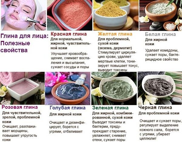 - Розовая глина: является результатом смешивания белой и красной глины. Она отлично подойдет для ухода за любым типом кожи.Разглаживает небольшие морщинки, смягчает кожу, подтягивает контур лица.Эта глина обладает омолаживающим эффектом. Питает и очищает кожу, делает ее более нежной и придает эластичность.Очищает чувствительную кожу. Снимает усталость и раздражение. Улучшает кровообращение. Очищает, смягчает. Питает кожу. Для кожи всех типов, в том числе чувствительной.