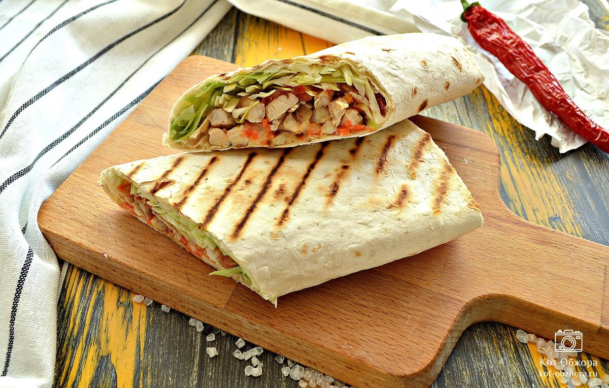 Продукты (на 2 порции) Лаваш тонкий - 2 листа Куриное филе (крупное) - 1 шт. Сыр твердый - 200-250 г Капуста белокочанная - 150 г Морковь по-корейски - 150 г Огурцы маринованные - 2 небольших Помидор свежий - 1 шт. Майонез - 5-6 ст. ложек Сметана - 2 ст. ложки Зелень свежая (петрушка, укроп) - 0,5 небольшого пучка Чеснок - 2-4 зубчика (по вкусу) Масло растительное для жарки - 2 ст. ложки Паприка молотая - 2 ч. л. Перец кайенский - 1 щепотка (по вкусу) Чеснок сушеный гранулированный - 1 ч. л. Приправа для курицы - 2 ч. л. Перец чёрный молотый - по вкусу Соль - по вкусу Для начала займемся курицей. Разрежем куриное филе на слайсы. Из одного филе получится где-то 4-5 кусочков. Хорошенько посолим курицу. Приправим сушеным чесноком, паприкой молотой, приправой для курицы, кайенским перцем и чёрным молотым перцем. Заправим растительным маслом и перемешаем.