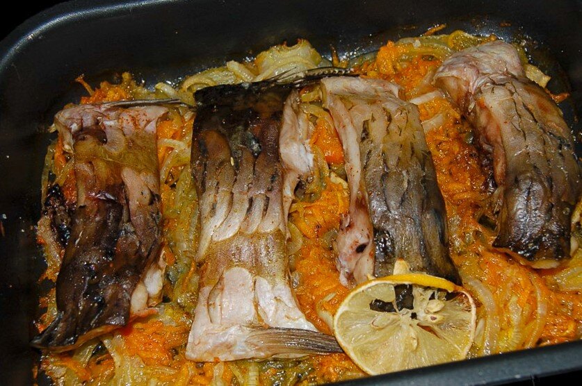 В форму для запекания выкладываем обжаренные лук с морковкой, немного солим, на них кладем слоем нарезанное соломкой яблоко и ломтики лимона, а сверху выкладываем подготовленные куски рыбы, сбрызгиваем растительным маслом, посыпаем любимыми приправами. Карп получает