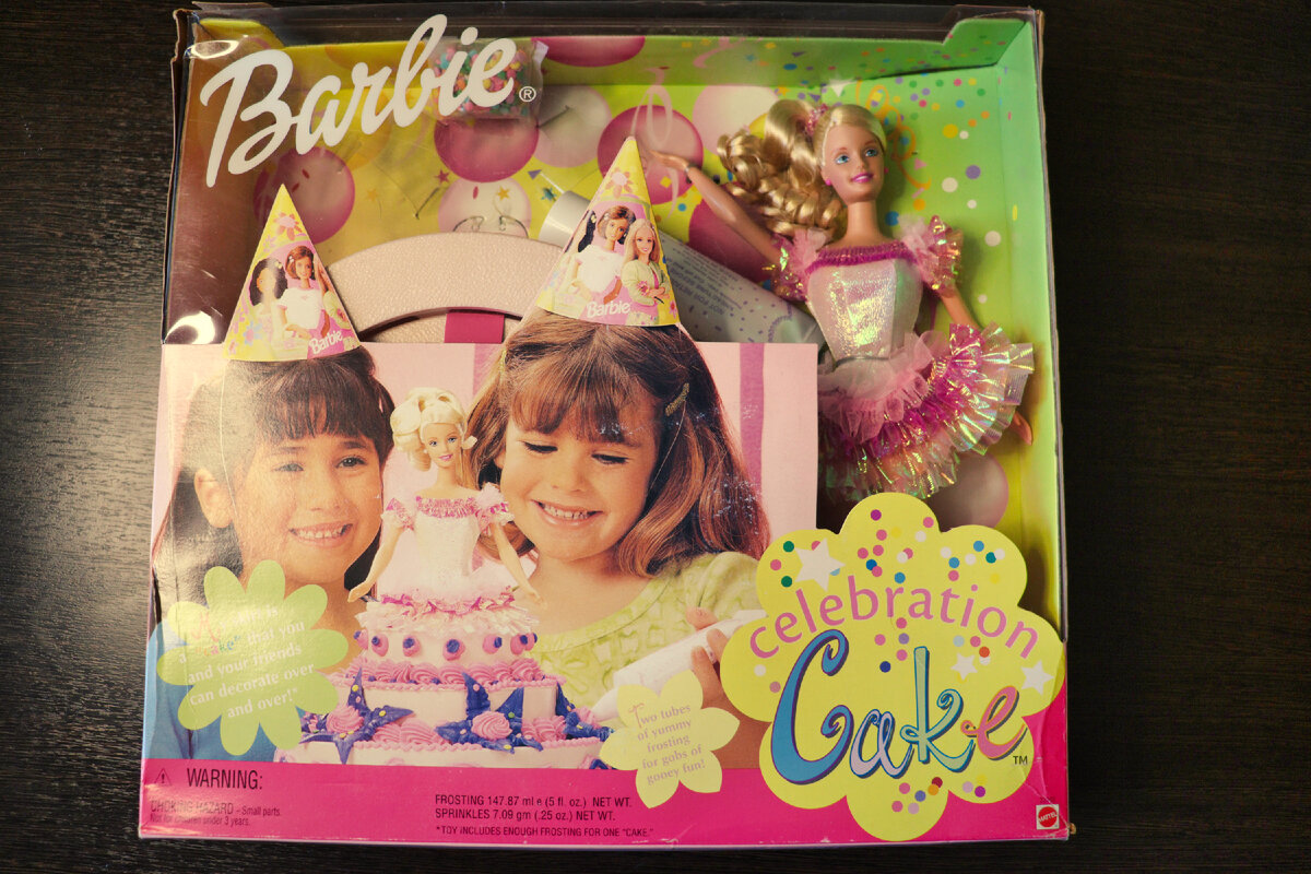 Распаковываю очень необычный набор 1999 года выпуска под названием Barbie Celebration Cake. Набор широко встречается в продаже на зарубежных сайтах. Но я не нашла никаких обзоров или распаковок этой модели – так что, кажется, мне предстоит стать первой. Для начала давайте посмотрим рекламу этого набора. О, эти неповторимые вайбы конца 90-х... Как видно из рекламы, на "юбке" Барби можно рисовать глазурью, превращая её в торт, украшать посыпкой, а потом весело схомячивать всю эту красоту вместе с подружками. Идея очень неплохая – но не слишком гигиеничная. Что ж, приступим к распаковке! Вот так выглядит набор в коробке. Крепления для тюбиков рассохлись со временем. Молд у этой Барби, вроде бы, классический Superstars, но что-то тут "не то", но что именно – не могу понять. Высокий хвост с мелкими локонами навевает мысли об образах артисток цирка. Внутри находится инструкция, которая рассказывает, как собирать "юбку", как правильно открывать тюбики, и как делать разные фигуры из крема