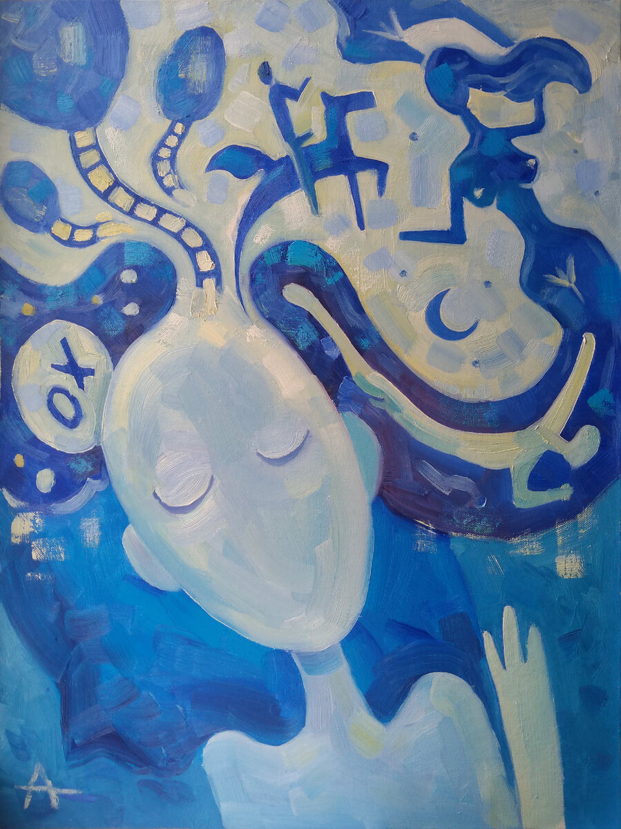 Художник Пликусов А. Н. Сюрреализм. На картине изображена фигура спящего человека и кадры из сновидения, которые он видит. Образ сна и фигуры плавно перетекает в нечто абстрактное, сливаясь воедино. Эта картина была написана быстро в момент сильного желания сна.