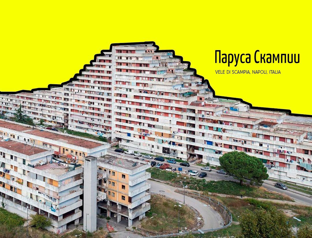 Архитектор Франческо Ди Сальво вдохновлялся известным французским архитектором и дизайнером Ле Корбюзье. Комплекс Vele di Scampia был назван так из-за зданий треугольной формы, напоминающих паруса, так как они широки у основания и сужаются по мере подъема. Адепт необрутализма Ди Сальво решил строить дома, которые передадут атмосферу неаполитанских переулков исторического центра. Основная жизнь должна происходить снаружи — поэтому в парусах очень много общих зон, вестибюлей и открытых площадок для зеленых насаждений. В период с 1962 и до 1975 построили семь парусов, а дальше стройка столкнулась с коррупцией и итальянской мафией каморрой. Самый дешевый цемент + мусор и отходы = дешевый неаполитанский бетон. Расстояние между двумя блоками, соединенными лестницами, по плану долж