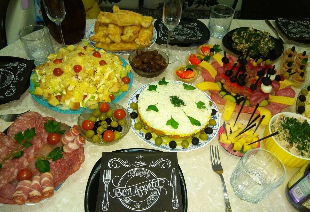 Я бы охарактеризовала вечеринку как «НОСТАЛЬЖИ» по старым добрым временам через призму МОЛОДОСТИ. Почему именно так? Да потому что в гости пригласила молодая пара! Но салаты были приготовлены по рецептам мам! это же так здорово, что семейное кулинарное дело продолжает жить) и передается следующим поколениям. Но, естественно, также были предложены и новые угощения, которые я взяла на заметку и непременно теперь тоже буду готовить. Этим и ценны походы в гости, потому что обязательно найдешь что-то интересное, чем и пополнишь свою бездонную КУЛИНАРНУЮ КОПИЛКУ) На праздничном столе красовались любимые во все времена салаты - «Оливье», «Мимоза» и «Крабовый». Последнее время мы их перестали готовить, все хочется что-то новое приготовить. А ведь это так вкусно было, помнится. А главное, появляется САМО ощущение праздника) Хозяйка и сама очень любит «Цезарь» поэтому и готовит его превосходно! Классический состав: жареные кусочки курицы в специях 300 гр, салат «Айсберг» 400 гр, порванный на