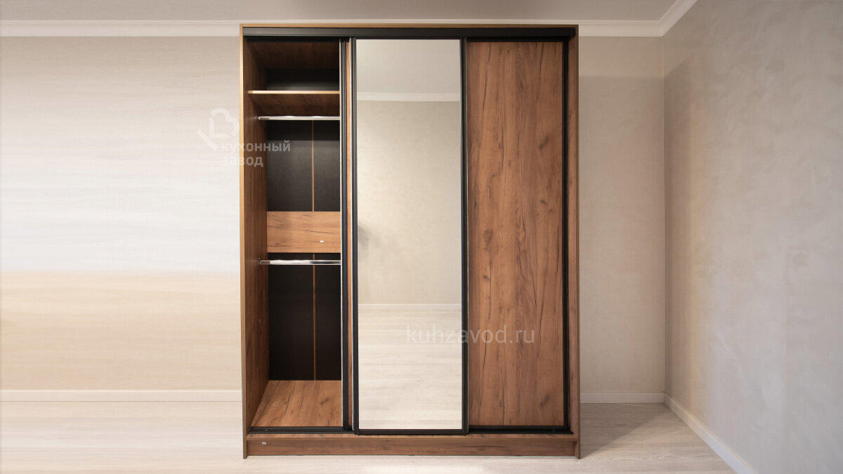 Шкафы-купе с фасадами под текстуру дерева сегодня на пике популярности — ведь жителю больших городов хочется, чтобы его интерьер был максимально близким к природе. Собрали для вас пять проектов шкафов с фасадами под дерево — смотрите и вдохновляйтесь на создание своего «шкафа мечты». #1. Компактный шкаф в оттенках ореха Размер: 120 см в длину, 70 см в глубину, 230 см в высоту Внутреннее наполнение: полки, штанги, ящики Для чего: для личных вещей семейной пары Такой шкаф идеально подойдет к интерьеру в современном эко-стиле. Сдержанный дизайн подчеркивает красоту естественного рисунка древесной структуры на боковых дверцах. Зеркало в центре визуально облегчает облик и зрительно вытягивает пространство вверх (потолки будут казаться выше). Черный алюминиевый профиль дверей-купе и черная задняя стенка шкафа добавляют графичности — мебель смотрится дорого и добротно и сама по себе может быть украшением, фокусной точкой интерьера. Базовое внутреннее наполнение (три штанги, полки и ящики в