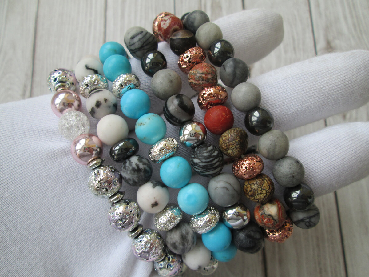 Спешим порадовать новинками: повседневные браслеты из натуральных камней. Пять новых моделей и одна давно полюбившаяся. Браслеты удобные, на двойной резинке, толщина 8 мм. Размеры 16 и 17. Представлены на маркетплейсах Wildberries и OZON. Начнём с яркого небесно-голубого турквенита (тонированного говлита). Бусины 8 мм имеют выемки и тёмные вкрапления естественного природного происхождения. Вставки из бусин лавы в форме таблетки 8*3 мм, окрашенные гальваническим способом в серебристый цвет. Размер 17 см. Браслет очень нежный, по-настоящему весенний. Подойдёт под любой стиль. Носите, с чем хотите, от потёртых джинс до строгой деловой одежды. Будет хорошо сочетаться с другими украшениями и браслетами для многослойности. Классика жанра. Чёрный, серый и стальной цвета. Строгий и стильный. Уже успевший полюбиться нашим покупателям браслет из вулканической лавы, гематита и лабрадорита. Лава чёрная и лава с гематитом, гальванически окрашенные в серебристый. Лабрадорит хорошего поделочного каче