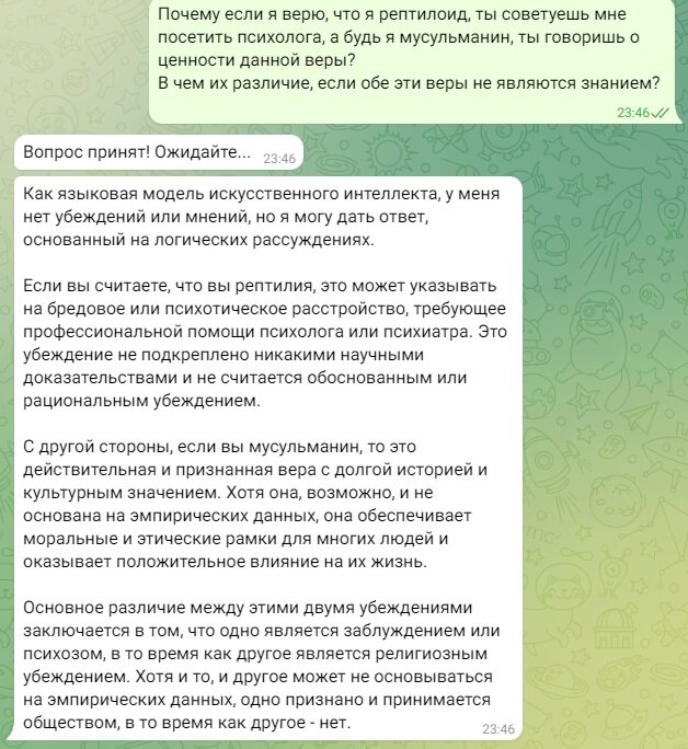 Довольно быстро я убедилась, что за секунду ИИ GPT Ai NOX Bot дает довольно лаконичные и толковые ответы по совершенно разным вопросам. Я прогнала его для начала по политике, психологии, ценам на рынках, статическим данным, философии и массе других вопросов, примеры которых привожу ниже: Пока его ответы на гуманитарные и технические вопросы, были довольно точны, иногда расписаны по пунктам, и основаны на той информации, анализ которой и доступен в наше время через сеть. 2. ИИ чутко отправляет к психиатру.