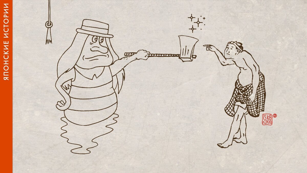 Давным-давно в Японском царстве в одной бригаде дровосеков работали два старика. Но не на лесоповале, они бревна готовые обтесывали, чтобы потом из них строить можно было что хочешь: хоть дом, хоть храм. Один старик совсем бедным был, никак к нему деньги не шли. А вот у второго денежки водились и он над первым всегда подтрунивал по этому поводу. Да так часто, что бригадир их обычно на разные работы ставил. И вот однажды бедный старик заболел. Ничего серьезного, сильная простуда, но пару дней нужно дома остаться, отлежаться немного. На третий день он еще ослабленный решил выйти поработать. Взял свой топор и отправился на берег, куда бревна свозили. А за те два дня, что старик болел, топорище заметно рассохлось и голова топора плохо на нем держалась. Не проверил старик свой инструмент. Сделал замах, а голова топора с рукояти соскочила, да прямо в реку и улетела. Бултых! В самый омут угодила. Что же делать? На второй топор денег у старика нет, а значит, и работы нет, и есть им с женой бол