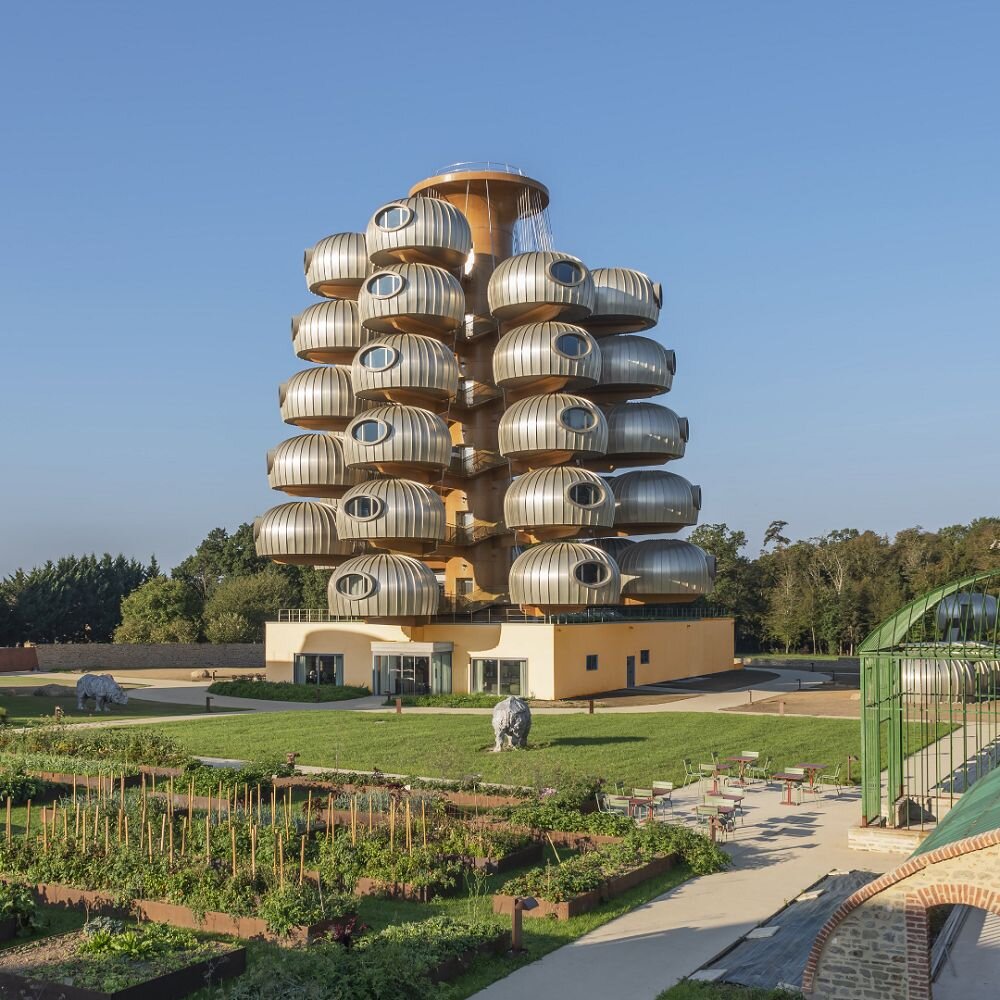 Вот честно, когда первый раз увидел фото этого здания я подумал, что это какие-то 60-тые. Но нет, это современность, и судя по всему, в 2019 году по Франции вообще бродила идея проживания на дереве, вот в Монпелье, к примеру, она проявилась в проекте "Белое дерево" . Наше сегодняшнее здание - отель L'EssenCiel, с французского литературно перевести у меня не получилось, это игра слов "порода деревьев" и "небо". Здание построено в 2019 году по проекту Agence d′Architecture Unité, расположено в коммуне Piré-Chancé, что неподалеку от Ренна. Здание гостиницы является частью комплекса Le Château Des Pères, куда входит, собственно историческое здание замка семьи Legendre (тоже превращенное в отель), а также спа-центр, ресторан высокой кухни (круглое здание) и парк скульптур. Здание реально спроектировано как дерево на ветках которого расположены 36 капсул-комнат, в "стволе" дерева расположен лифт, также в стороне от створа пристроена эвакуационная лестница. В интервью проектировщик