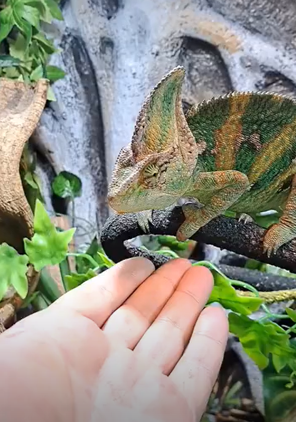 Поговаривают, йеменский хамелеон является одним из самых крупных и агрессивных представителей своего семейства, по этому, все, что работает с йеменцем, наверняка, сработает и с другими. Итак! 1. Размер террариума. Приручения начинается, как ни странно, с выбора террариума. Не смотря на то, что взрослому хамику нужен большой вертикальный террариум, малышу, подойдет террариум меньшего размера, например, 45*45*60 (ш.д.в). В меньшем террариуме хамик в первое время будет меньше стрессовать, быстрее пройдет адаптация и появится интерес к окружающему миру. Мой первый хамелеон Халк рос именно в таком террариуме. Всего лишь через пару дней, он перестал бояться меня и прятаться. Второй хамелеон Зевс сразу очутился в большом террариуме, где первые дни я его с трудом мог найти. Прошло два месяца, а Зевс все еще довольно робко себя ведет. Конечно, приобрести даже один террариум дово