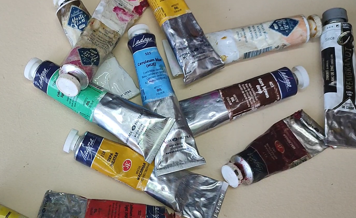 Советов по поводу разбавителя в интернете очень много. Кто-то рекомендует пользоваться чистым скипидаром, кто-то его смешивает с другими маслами. Кто-то использует «разбавитель без запаха», а кто-то покупает «тройник». Преподаватели в университете рекомендуют готовить тройник самому: 1 часть пинена, 1 часть льняного масла и 1 часть даммарного лака. Даммарный лак очень вонючий, поэтому дома его сильно не по используешь. Поэтому проще всего купить бутылочку льняного масла и разбавителя №4, и смешать в пропорции 1:1. Хватает этого добра надолго.