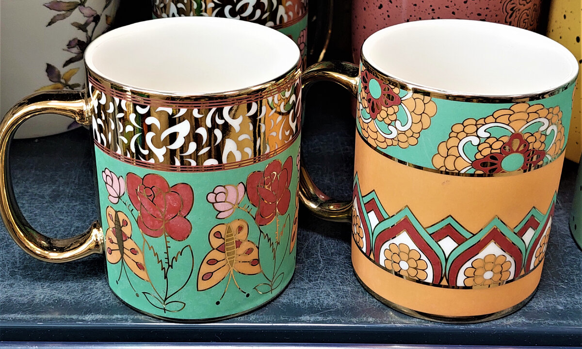 И сразу обратили на себя внимание новые кружки - просто ручная роспись! Цветы и бабочки порхают - 335мл 99 руб.