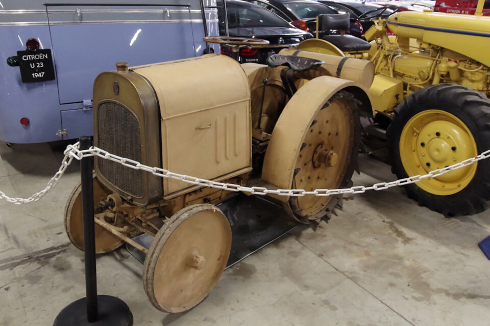 Если честно, то я абсолютно не понимаю, когда именно был сделан этот трактор. Музей о нем вообще ничего не рассказывает, а сайт Citroen Origins упоминает только о Type J 1939 года, причем там есть рекламные брошюры именно этого трактора, где люди явно одеты по моде 1920-х годов. Да и внешний вид машины серьезно отличается от «настоящего» Type J на заднем плане. Единственное, что я нашел по фотографии — были какие-то модели тракторов с надписью «1919 год», так что будем считать, что это оно и есть.
