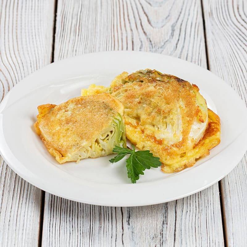 Капустные листья, сыр 100 гр, яйца 2 шт, панировочные сухари, растительное масло 100 гр, помидоры 4 шт, чеснок 2 зубчика, ветчина 100 гр, перец и соль по вкусу. Капустные листья ошпарить кипятком, чтобы стали мягкими. Ветчину обжарить. Яйца смешать с 2 ложками воды и взбить. На каждый капустный лист выложить ветчину и сыр, свернуть конвертиком, запланировать в муке, смочить во взбитые яйцах , повалять в панировочных сухарях и обжарить с двух сторон. Отдельно обжарить помидоры с чесноком, посолить, поперчить и выложить на тарелку к шницелю. Готово! Посыпать рубленой зеленью.