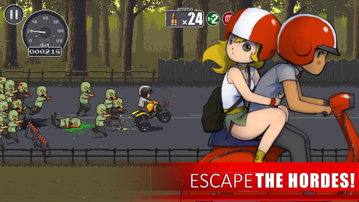 Dead Ahead — это очень динамичные аркадные гонки с элементами экшена для Android и iOS, в которой нас ждет настоящая зомби-мясорубка. Игра получила мрачноватый дизайн локаций, интересное графическое оформление в стиле Pixel-Art, неплохое звуковое сопровождение и довольно увлекательный геймплей. Несмотря на то, что это гонки, здесь нет ни соперников, ни призовых мест. Хотя, разве плохой наградой является жизнь, которую мы можем сохранить подопечному? К тому же нам платят за покатушки, а на вырученные деньги можно покупать мотоциклы и оружие, а также улучшать те, что уже имеем. На протяжении всего процесса, мы будем гонять по прямой дороге и давить мертвяков. Кроме того, придется отстреливать тех зомби, что обладают хорошей скоростью и постепенно догоняют протагониста. А еще нужно умудряться объезжать препятствия в виде беспорядочно стоящих машин и почаще прыгать через трамплины. Уровень здесь один и он бесконечный, но ландшафт меняется, если мы умудряемся продержаться в игре определенно