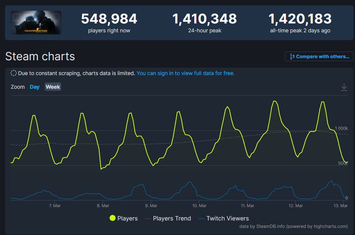 На прошедших выходных популярный соревновательный шутер Counter-Strike: Global Offensive побил все свои предыдущие рекорды одновременного онлайна игроков. Напомним, что только в прошлом месяце игра смогла поставить рекорд в 1,32 миллиона игроков, а новый рекорд составил 1 420 183 игрока в сети одновременно. До февраля текущего года рекордным одновременным онлайном Counter-Strike: Global Offensive было 1 308 963 игрока. Вполне вероятно, что новые рекорды связаны с тем, что инсайдеры твердят о скором анонсе Counter-Strike 2, которая раньше также была замечена в утечке из NVIDIA GeForce Now. Заявляется, что бета может быть анонсирована уже в этом месяце.