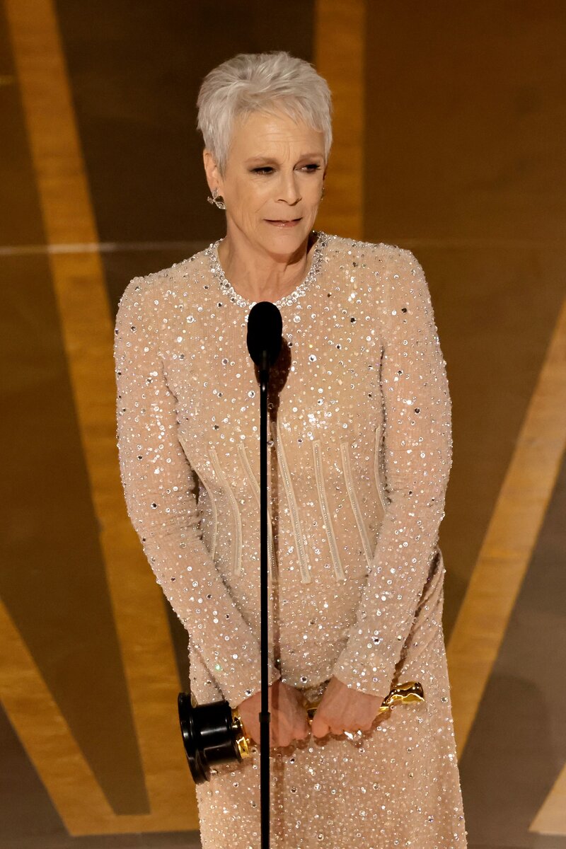 В неожиданно сдержанном и нежном платье от Дольче Габбана после нескольких ярких выходов на других премиях года Джейми Ли Кертис, получившая заветную статуэтку за лучшую женскую роль второго плана.