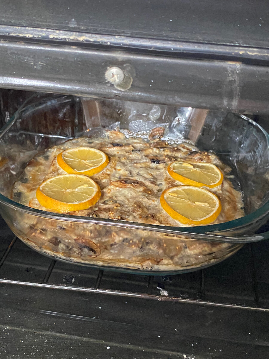 На противень налейте чутка подсолнечного масла и положите рыбу. Добавляю приправу для рыбы и по две дольки лимонов. В прикуску нарезаю 3 больших шампиньона, смешиваю с майонезом, соль и семя горчицы. И в духовку на 30-40 минут. Приятного аппетита