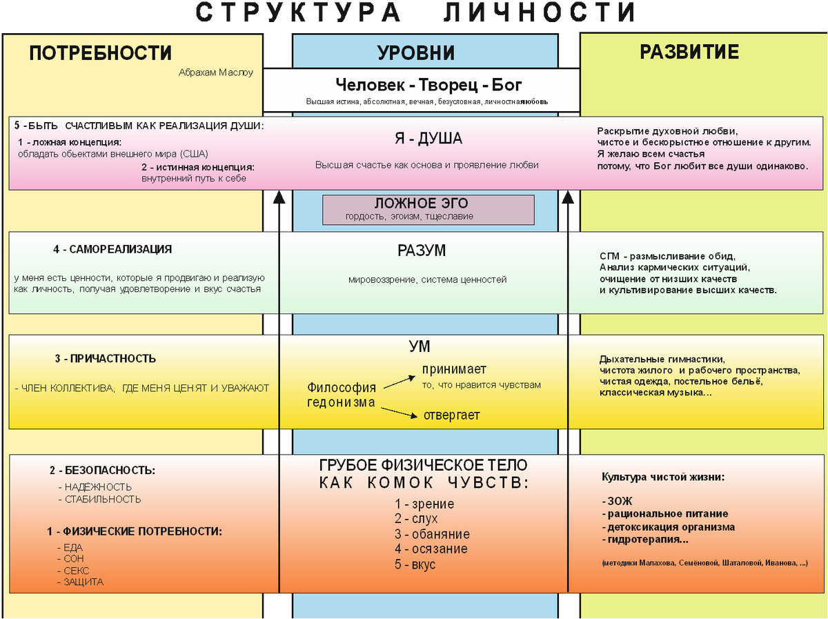 В таблице показано, что нужно делать, чтобы развить и очистить различные уровни своей личности и конечно, движение в этом направлении необходимо осуществлять от простого к сложному, снизу вверх. Нельзя кидаться в чистки, голодания, духовность и прочее не изучив и усвоив достаточное количество информации, не набрав критического объема знаний, необходимых для практических шагов без переживания стресса и получения максимально положительного результата.