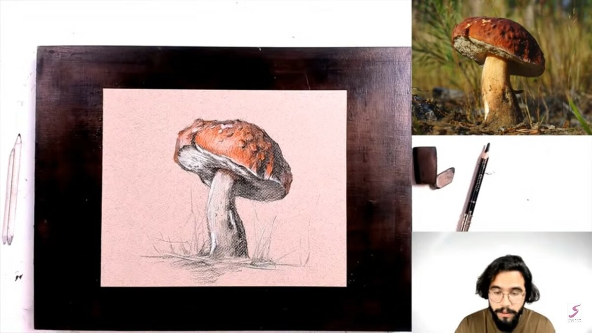 На мастер-классе вы увидите, как хорошо и гармонично сочетаются между собой сухие графические материалы, а восковой карандаш их отлично дополняет. Кроме того, нарисовать гриб вам поможет готовый тон на бумаге, облегчив ваши штрихи и пятна.