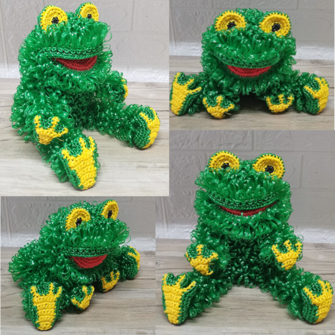Мочалка лягушка – это игрушка, которая связана крючком из полипропиленовой нити и весит 186 грамм. Одевается на руку, что делает ее отличным аксессуаром для ролевых игр или в качестве предмета интерьера. Кроме того, благодаря тому, что полипропиленовая нить безопасна и не размножает бактерии, мочалка лягушка может использоваться и как мочалка для тела.