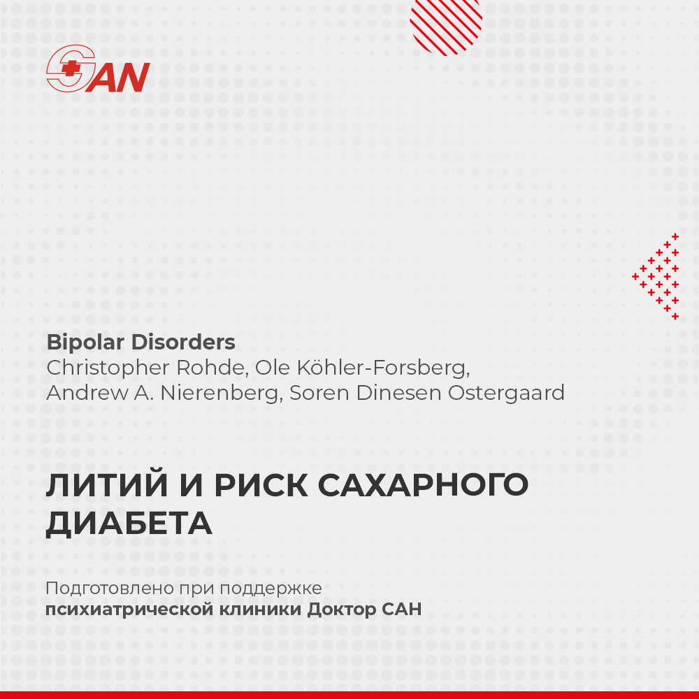 Лечение антипсихотиками и противоэпилептическими препаратами связано с повышенным риском развития сахарного диабета (СД), однако литий может оказывать противоположный эффект за счет ингибирования киназы гликогенсинтазы-3. В исследовании выявлялась взаимосвязь лечения биполярного расстройства литием, антипсихотиками или противоэпилептическими препаратами с риском СД в реальных клинических условиях. За время наблюдения СД развился у 6,9% исследуемых пациентов. По сравнению с лицами, не принимавшими соответствующие препараты, не было обнаружено клинически или статистически значимой разницы в отношении риска развития СД среди пациентов, получавших литий или ламотриджин. У пациентов, получающих вальпроаты и антипсихотики, был повышен риск развития СД. Для антипсихотиков наблюдалась четкая кумулятивная связь типа «доза-реакция» с риском СД. Источник: https://onlinelibrary.wiley.com/doi/full/10.1111/bdi.13308