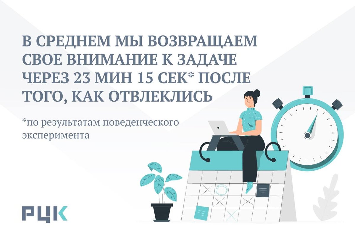 Представьте, что вы сконцентрированы на определенной задаче и: ▫️ вас отвлек коллега внезапным вопросом; ▫️ вы сами отвлеклись на уведомление в социальной сети; ▫️ вы решили проверить скидки в любимом магазине. Знакомая ситуация? ☝️ В среднем мы отвлекаемся на 3 мин и 5 сек при взаимодействии «человек-человек» и на 2 мин и 11 сек при работе с электронным устройством (компьютер, телефон). Что же происходит далее? Расскажем в наших карточках.