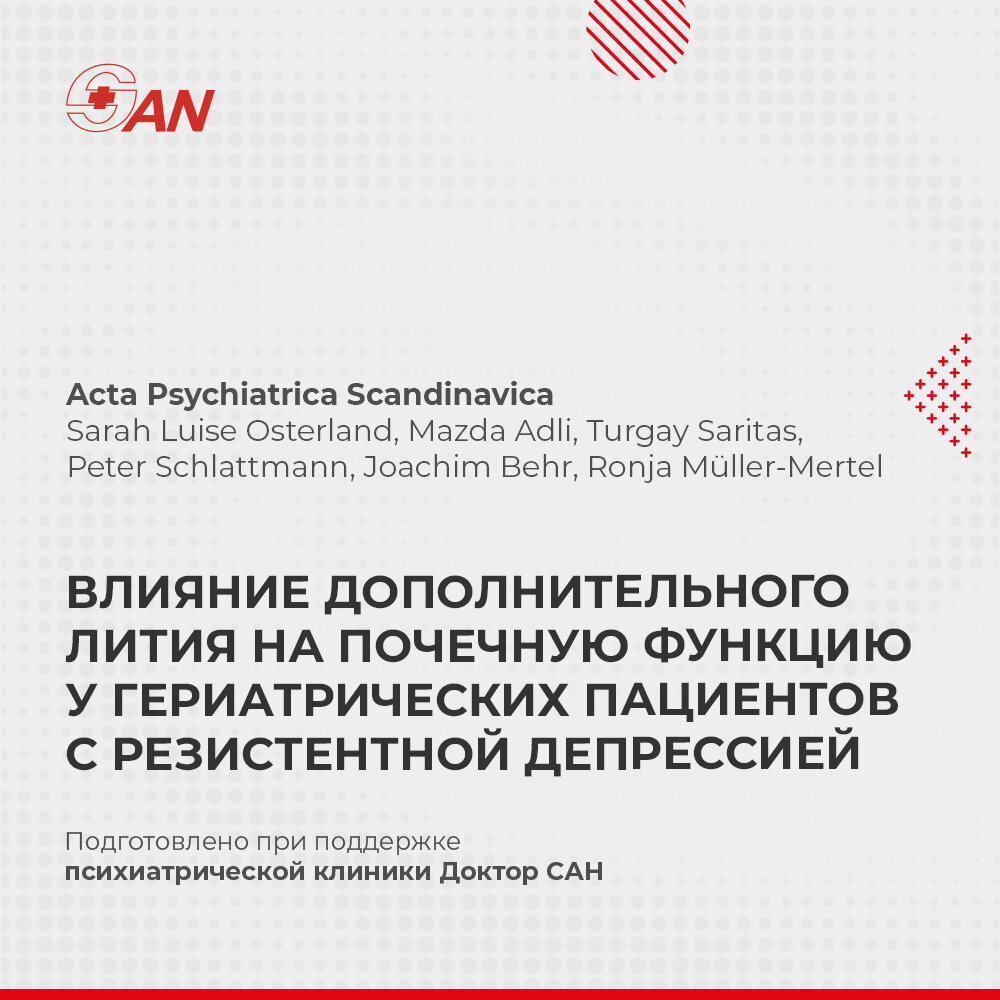 Литиевая аугментация (ЛА) антидепрессантов является вариантом терапии первой линии при терапевтически резистентной депрессии (ТРД). Тем не менее он редко используется у гериатрических пациентов из-за риска почечной токсичности. В исследовании сравнивались изменения расчетной скорости клубочковой фильтрации (рСКФ) и число острых повреждений почек (ОПП) с использованием ЛА у гериатрических пациентов с негериатрическими пациентами. Обе возрастные группы показали значимое снижение рСКФ в течение курса лечения. Однако влияние ЛА на снижение рСКФ не отличалось между возрастными группами. Уровень лития в сыворотке оказал значительное влияние на снижение рСКФ. ОПП наблюдались в гериатрической возрастной группе, когда уровни лития в сыворотке превышали терапевтический диапазон >0,8 ммоль/л. Подробнее о лечении депрессии: https://doctorsan.ru/lechenie-depressii